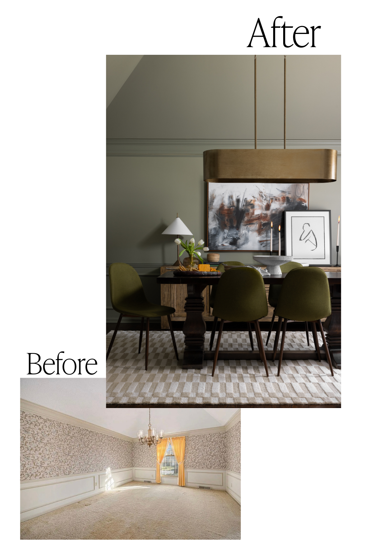 The dining room needed a full reset. We removed wallpaper and color drenched the room in the same shade as the kitchen island, added a statement light fixture, and furnished the room to feel like a formal dining room, but not stuffy.